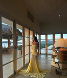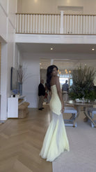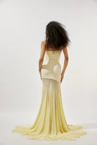 Indulge in the allure of sophistication with this butter yellow malai lycra tube gown, adorned with flared mesh panels for a touch of whimsical charm. The strapless bodice contours your figure with a flattering silhouette, while the buttery hue infuses warmth and vibrancy into your ensemble. Flowing from the waist down, the flared mesh panels add movement and dimension, creating an enchanting aura as you glide across the room. This gown exudes timeless elegance and feminine grace, ensuring you stand out with effortless poise and style.