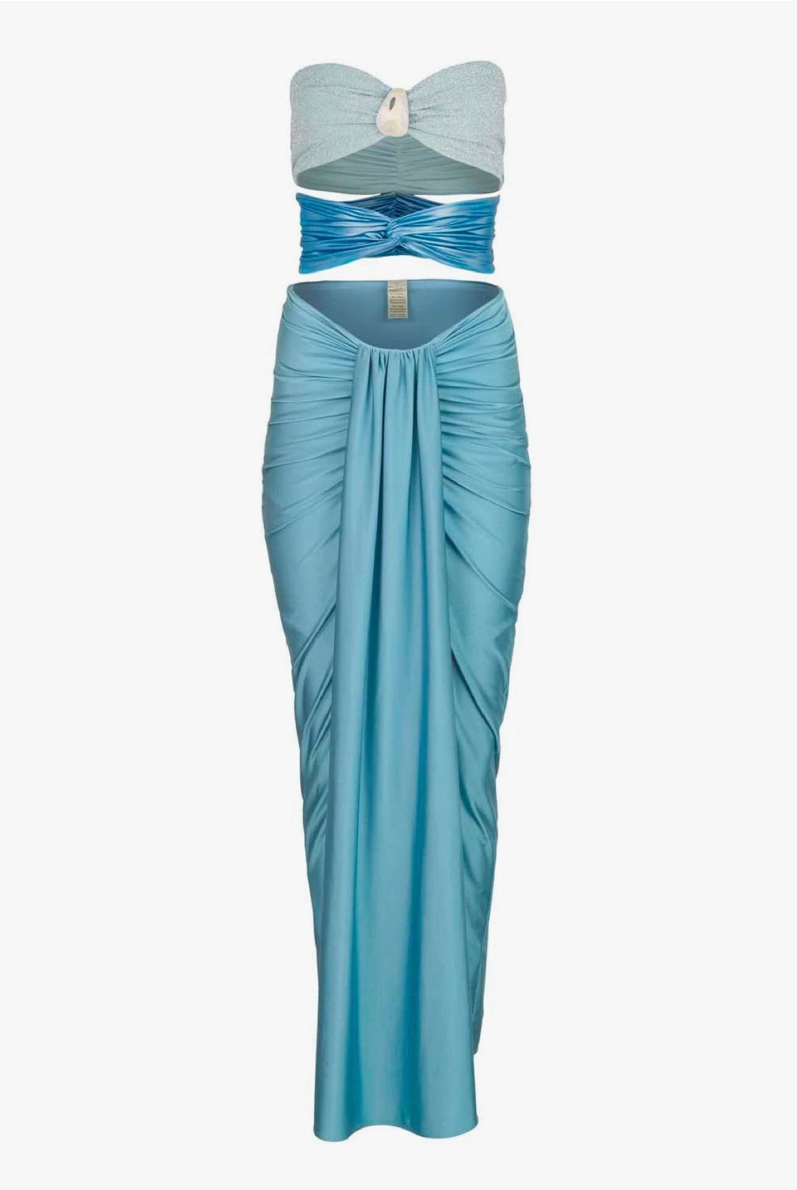 Introducing the "Giselle Dress" in Reef – offering unparalleled versatility, this dress can be worn as a full ensemble or as separate pieces. Featuring a strapless sweetheart neckline, the top showcases two bands with knot details at the center, adding a touch of elegance. The skirt is designed with a cascading detail at the front, creating a graceful and flowing silhouette. Perfect for any occasion, the dress seamlessly combines style and adaptability.