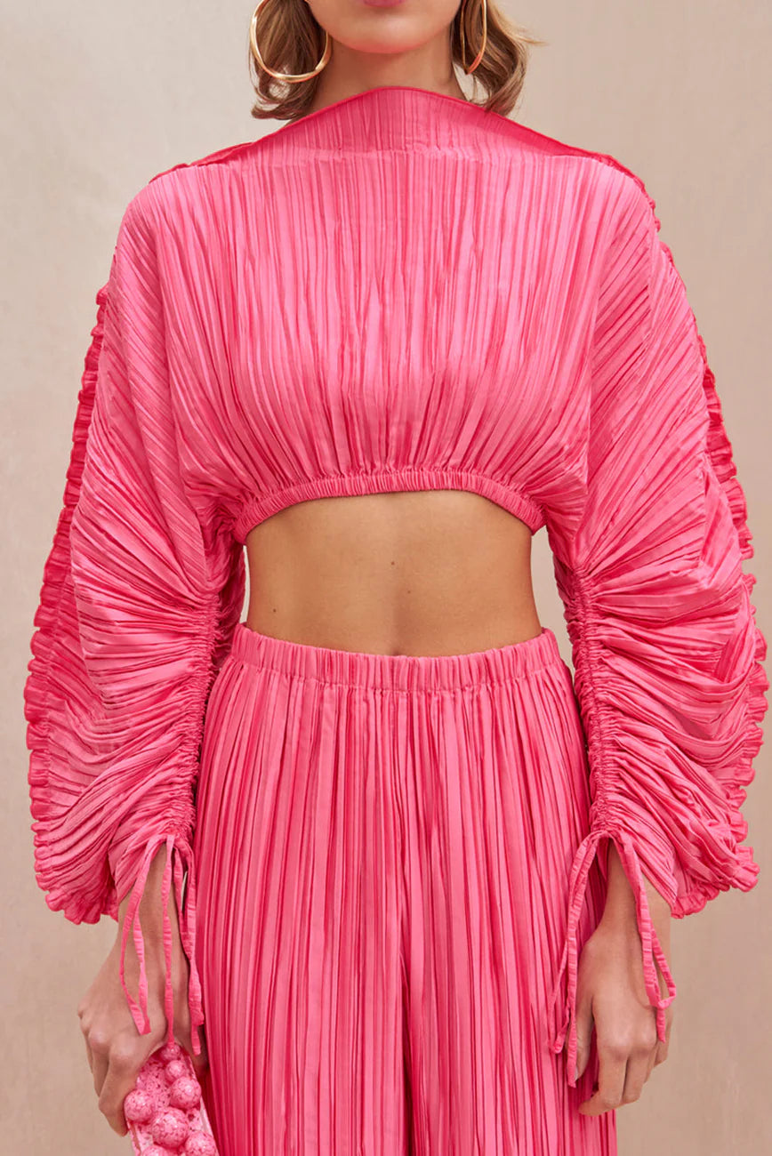 The wide neckline nears the shoulders, while artistic ruching highlights each blouson sleeve. Elastic at the wrists and waist allows for easy and comfortable wear. Wear with the coordinating Stacie Pant in Sangria for a full Gaia look.